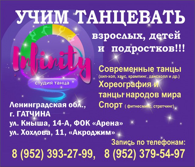 Студия танца "Infinity" в Гатчине: занятия для взрослых, детей и подростков. Студия танца “INFINITY” в Гатчине приглашает взрослых, подростков и детей к себе на занятия! Мы учим танцевать с 2010 года! У нас: - 20 групп разного уровня подготовки - Профессиональное развитие у дипломированных педагогов и хореографов: показательные выступления, участие в соревнованиях, конкурсах, концертах - Комплексная система обучения: зачёты, открытые уроки, отчётные концерты, городские и выездные лагеря - Высокие результаты - Дружеская атмосфера МЫ ПРИГЛАШАЕМ НА ЗАНЯТИЯ : СОВРЕМЕННЫЕ ТАНЦЫ : • Хип-хоп • Хаус • Крампинг 11+ лет • Джаз-Фанк 12+ лет • Дансхолл 14+ лет • Контемпорари 12+ лет Современные танец дети 4-6 лет ХОРЕОГРАФИЯ • Хореография Малыши 3-5 лет • Хореография и танцы народов мира 6-11 лет • Современная хореография 7-11 лет СПОРТ • Фитнесмикс • Стретчинг С 2023 года у нас открывается Хореографическое отделение - классическая, народная и современная хореография, и хореография для детей от 3 лет! Более 2000 человек прошли обучение у нас! Наши ученики - победители и финалисты соревнований, студенты хореографических вузов и тренера танцевальных направлений. Наши залы: Ленинградская обл., г. Гатчина, ул. Генерала Кныша 14-А, ФОК “Арена” Ленинградская обл., г. Гатчина, ул. Хохлова, 11, “Акроджим” Тел. 8 (952) 393-27-99 (можно писать в WhatsApp) Тел. 8 (952) 379-54-97 Тел. 8 (81371) 75-746 Наша группа ВКонтакте: https://vk.com/infinity_club До Встречи на Занятиях в Студии “INFINITY”! В Интернете (в поисковиках) нас находят, в частности, по таким словам: студия танца Гатчина, танцы Гатчина, научиться танцевать Гатчина, танцы для взрослых Гатчина, танцы для детей Гатчина, танцы для подростков Гатчина, современные танцы Гатчина, современная хореография Гатчина, фитнесмикс Гатчина, стретчинг Гатчина. #студиятанца #Гатчина #научитьсятанцевать #танцыдлявзрослых #Гатчинскийрайон #танцыдлядетей #Ленинградскаяобласть #танцы