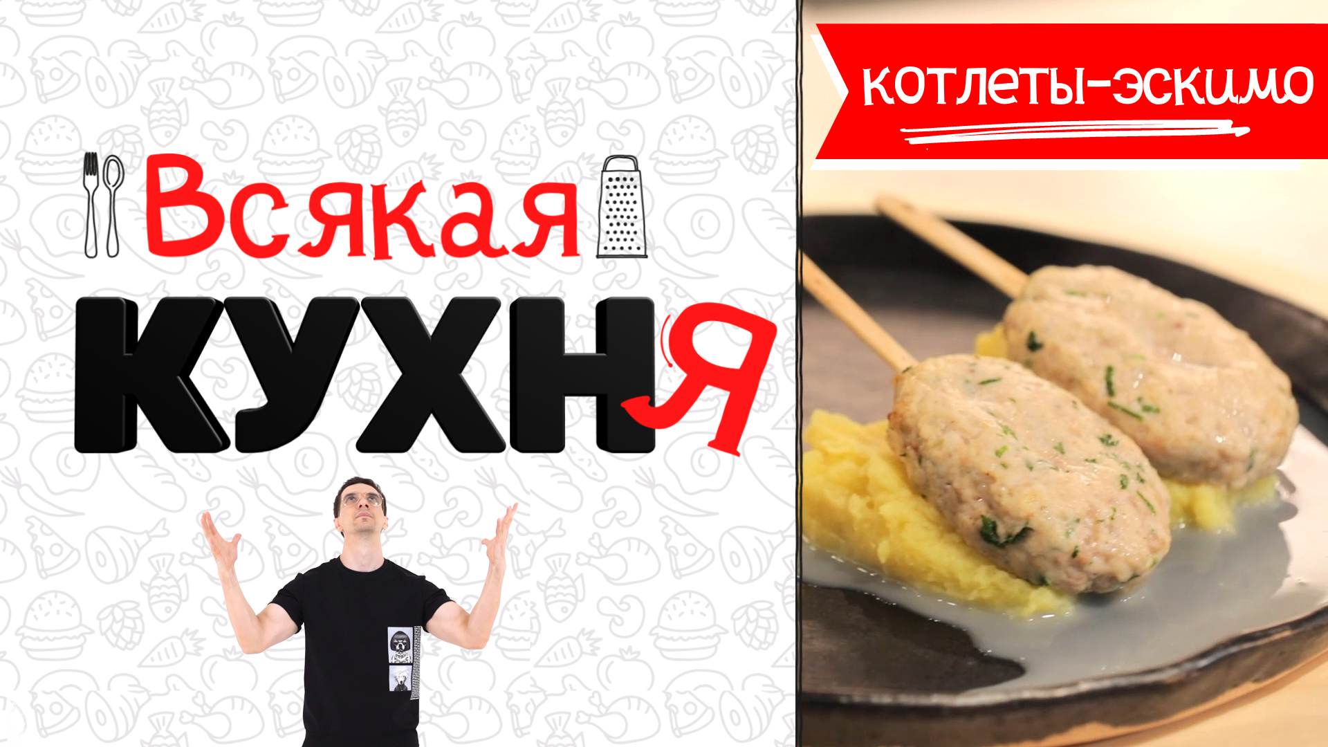 В этом выпуске готовим котлеты-эскимо! Они точно понравятся и вам, и вашим детям, а если детям понравятся больше, чем вам, то вам и не достанется ничего! Принцип «Всякой кухнИ» всё тот же: профессионал готовит, а недопрофессионал-ведущий пытается повторить. В конце выпуска вы узнаете не только рецепт вкусного блюда, но и поймете, сложно ли его готовить и справитесь ли вы лучше ведущего! РЕЦЕПТ! Ингредиенты: (Для котлет) - куриные бедра (без кожи и костей) - 150 гр - Куриное филе - 150 гр - лук репчатый - 60 гр - специи по вкусу (Для пюре) - картофель- 400 - рисовое молоко- 100 Способ приготовления! Котлеты-эскимо: Лук режем и обжариваем в сотейнике с добавлением соли и щепотки сахара! Пропускаем мясо и жареный лук через мясорубку! Хорошо вымешиваем и формируем виде эскимо! Вставляем палочки для мороженного, торчащий край оборачиваем фольгой и запекаем в разогретой до 180 градусов духовке 10 минут (до готовности)! Пюре с овсяным молоком: Картофель нарезаем, замачиваем в холодной воде на 30 минут и варим в кипящей подсоленной воде до готовности! Сливаем воду и превращаем в пюре с добавлением рисового молока! Соль добавляем по вкусу! Приятного аппетита!