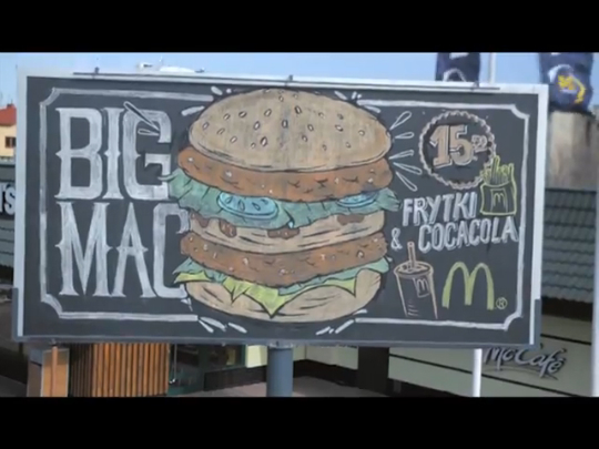 Наверняка, все видели меловые доски, которые используются при входе в кафе для привлечения внимания посетителей. Варшавское агентство DDB использовало эту идею в рекламе McDonald’s, заменив доску на полноценный билборд. Дважды в день уличный художник Stefan Szwed-Stronzynski по мере обновления меню в ресторане перерисовывает мелом картинку на рекламном щите. Утром билборд рекламирует кофе и МакМаффин, после полудня — БигМак и картофель фри.