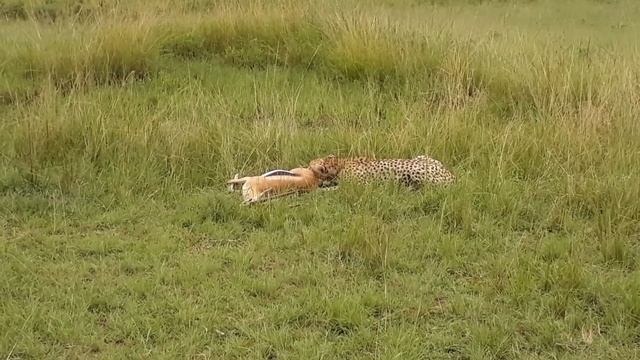 The cheetah (Acinonyx jubatus) is a large cat native to Africa and central Iran. It is the fastest land animal, estimated to be capable of running at 80 to 128 km/h (50 to 80 mph) with the fastest reliably recorded speeds being 93 and 98 km/h (58 and 61 mph), and as such has several adaptations for speed, including a light build, long thin legs and a long tail. It typically reaches 67–94 cm (26–37 in) at the shoulder, and the head-and-body length is between 1.1 and 1.5 m (3 ft 7 in and 4 ft 11 in). Adults weigh between 21 and 72 kg (46 and 159 lb). Its head is small, rounded, and has a short snout and black tear-like facial streaks. The coat is typically tawny to creamy white or pale buff and is mostly covered with evenly spaced, solid black spots. Four subspecies are recognised.This video was taken in Masai Mara National Park , April 2018.