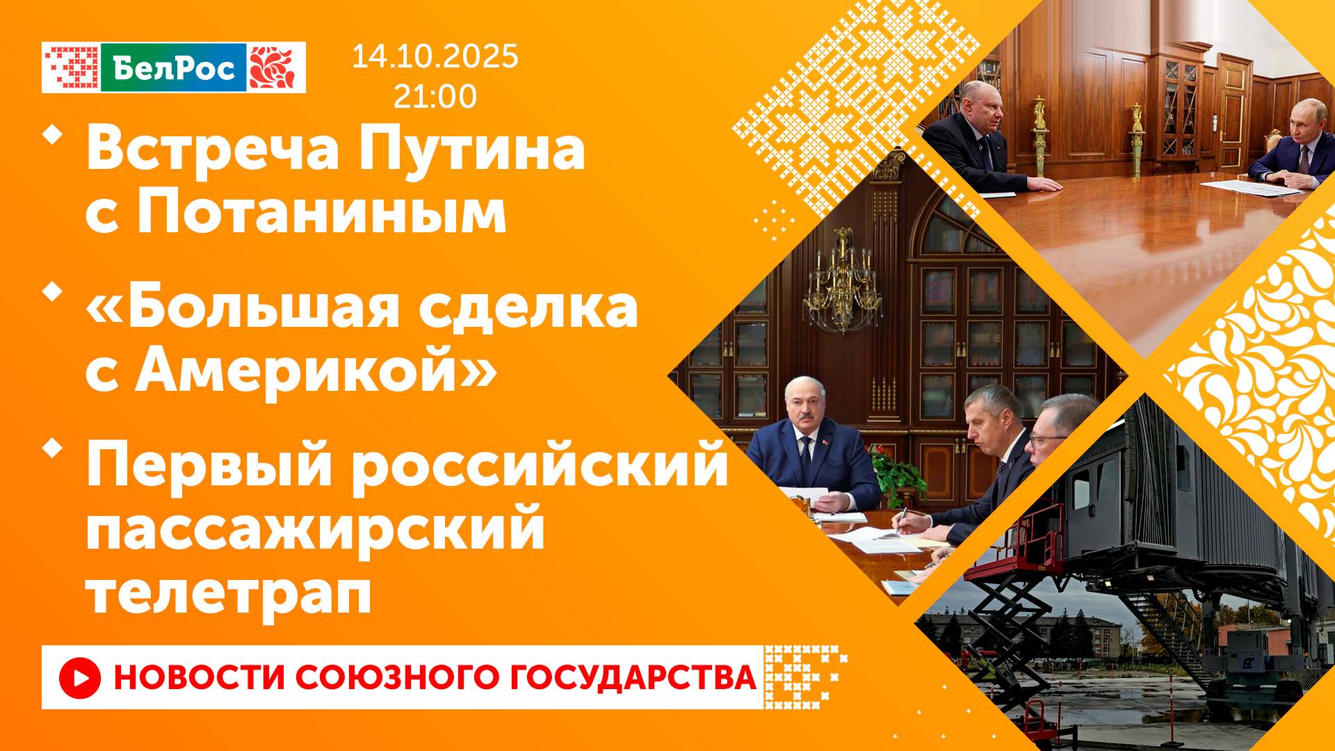Закадровый текст озвучивает *ИИ Антон* Новости 14.10.2025 на 21:00 - Владимир Потанин: "Норникель" полностью покрывает потребности России в редких металлах. - Минск готов принять инициативу США по урегулированию конфликта на Украине. - Александр Лукашенко: мы готовы заключить большую сделку с США. - Глава КГБ Беларуси: есть все шансы достичь прорыва в отношениях с США. - В России разработали первый отечественный телетрап для аэропортов. Смотрите главные новости Союзного государства на телеканале БелРос. Ссылки на наши соц. сети Сайт: http://belros.tv/ Telegram: https://t.me/belrostv Одноклассники: https://ok.ru/group/55657426976918 ВКонтакте: https://vk.com/belrostv TikTok: https://www.tiktok.com/@belros_tv?_t=... RuTube: https://rutube.ru/channel/23501830/ Яндекс. Дзен: https://zen.yandex.ru/belrostvv Наши подкасты на Яндекс. Музыке: https://music.yandex.ru/album/25615251 #главныеновости #новостисегодня #СоюзноеГосударство