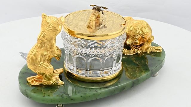 •Медовница на камне "Медвежата" – это уникальное изделие ручной работы, сочетающее в себе природную красоту камня и искусность ювелирного мастерства. •Материалы: бронза, латунь, иркутский нефрит, стекло. •Покрытие: никель (20 мкм), золото (999,9 пробы, 5 мкм). •Техника исполнения: - Травление и гравировка для создания тонких узоров. - Ручная подрезка и токарные работы для точности деталей. - Никелирование и золочение для придания благородного блеска. - Ювелирные работы для завершения образа. •Особенности: - Каждый камень (иркутский нефрит) имеет уникальный рисунок и оттенок, поэтому изделие может незначительно отличаться от представленного на фото. - Идеально подходит для подарка ценителям эксклюзивных вещей и коллекционерам. •Изделие поставляется в подарочной упаковке. •Этот предмет станет изысканным украшением интерьера или памятным подарком, подчеркивающим индивидуальность и вкус своего владельца.