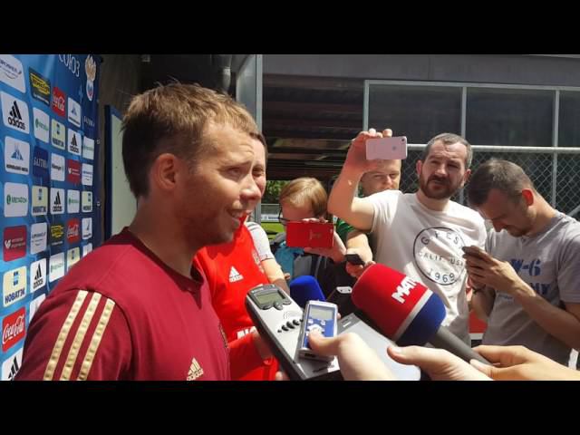 Сборная России по футболу провела первую тренировку в швейцарском Бад-Рагаце в рамках подготовки к чемпионату Европы. После занятия на вопросы журналистов ответил защитник национальной команды Роман Шишкин.