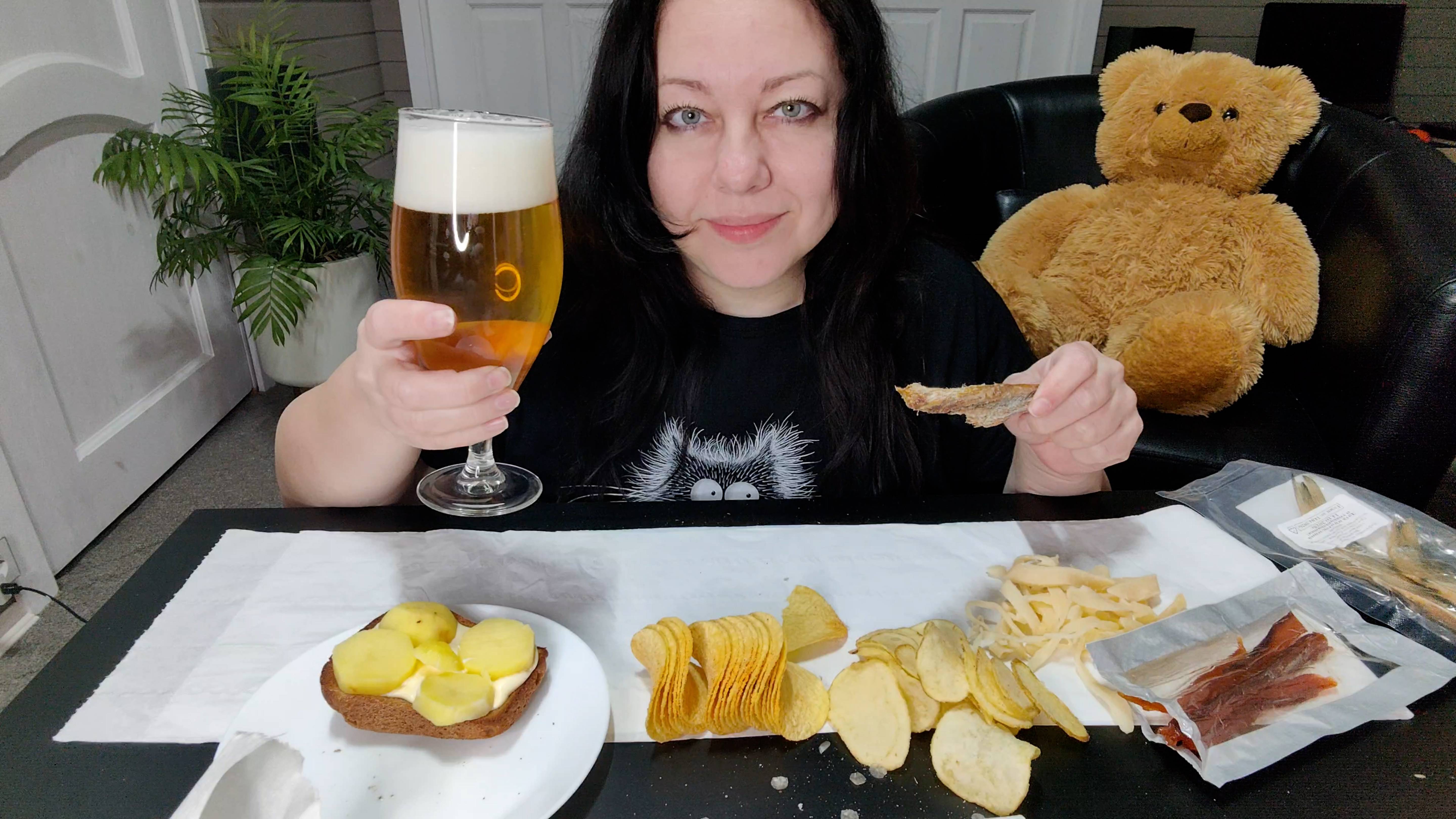 Мукбанг Вобла, Горбуша вяленая, Кольца кальмара, Чипсы и Бутерброд с картошкой)