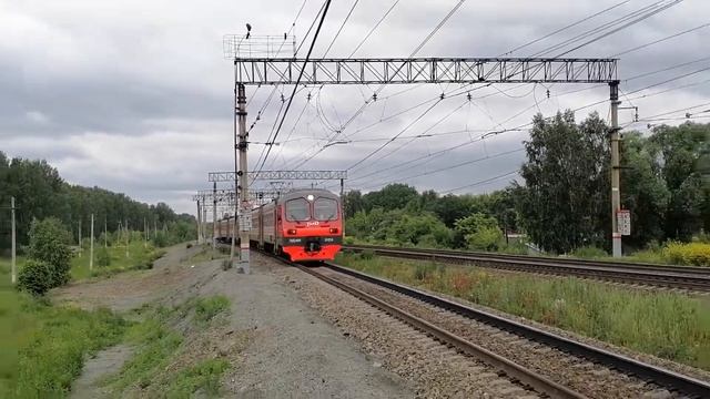 Электропоезд ЭД4М-0174 с пригородным поездом №6016 Миасс-1 — Челябинск-Главный в 6-ти вагонной составности прибывает на О.п. Бутаки, Челябинская обл., ЮУЖД Дата: 21.06.2022