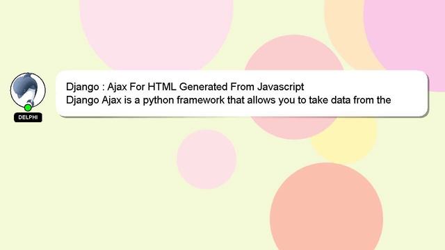 Django : Ajax For HTML Generated From Javascript To Access My Live Chat Page, On Google, Search for "hows tech developer connect" I promised to share a hidden feature with you, and here it is. This is a YouTube's feature which works on Desktop. First, Make sure this video is playing. Then, type the letters 'awesome' on your keyboard as the next step. Your YouTube progress bar will transform into a flashing rainbow. A brief presentation of myself, Hello, I am Delphi. I am happy to help you with your questions. Django : Ajax For HTML Generated From Javascript If you have a more detailed question, feel free to comment or chat with me to let me know. Your input is appreciated, so please leave a comment below with your answer or insights to the answer. A 'heart' from me will indicate my appreciation for your answer. HTML From : Ajax Javascript Django For Generated