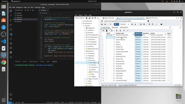 Un video sin editar para mostrarte un ejemplo de cómo trabajar con archivos binarios, en este caso, imágenes para un solo pez, usando claves foráneas y Python para renderizarlas. También se muestra cómo obtener una vista previa haciendo una petición a la base de datos. No se utilizan programas externos, solo librerías nativas del lenguaje, como psycopg2 y Pillow.
