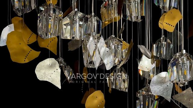 Прозрачные кристаллические элементы словно застыли в воздухе, а между ними — металлические фрагменты сложной, неровной формы. Они напоминают лепестки, осколки, следы движения или частицы, подхваченные потоком. Ничто не повторяется буквально: каждая деталь живёт своей траекторией. Особую роль играет контраст материалов: — холодная, идеально огранённая прозрачность хрусталя — тёплый металл в оттенках латуни, бронзы и серебра с перфорацией и живой фактурой Световая композиция Vargov®Design LC0470 — это не просто декоративный объект. Это визуальный ритм. Это момент, в котором форма важнее симметрии, а ощущение — важнее очевидного.