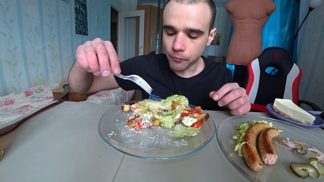 МУКБАНГ КОЛБАСКИ ОХОТНИЧЬИ / БУРГЕР С РЫБОЙ / САЛАТ ЦЕЗАРЬ / ЧИЗКЕЙК / EATING Mukbang ASMR АСМР