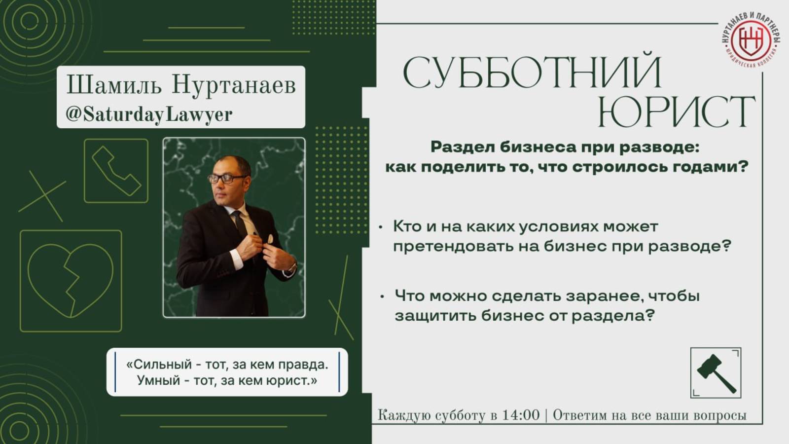 Друзья, каждую субботу в Telegram-канале "Субботний юрист" (https://t.me/SaturdayLawyer) мы проводим для вас увлекательнейшие трансляции, тема которой подбирается на основе ваших обращений в Юридическую коллегию "Нуртанаев и партнеры" Каждый из вас может задать вопрос нам на сайте или в соцсетях по ссылке: https://clck.ru/3ByDxh Также, вы можете просто связаться с нами по номеру +7(495)006-78-08, по вашему желанию ответы прозвучат прямом эфире Скорее подписывайтесь, чтобы не пропустить следующую трансляцию: https://t.me/SaturdayLawyer
