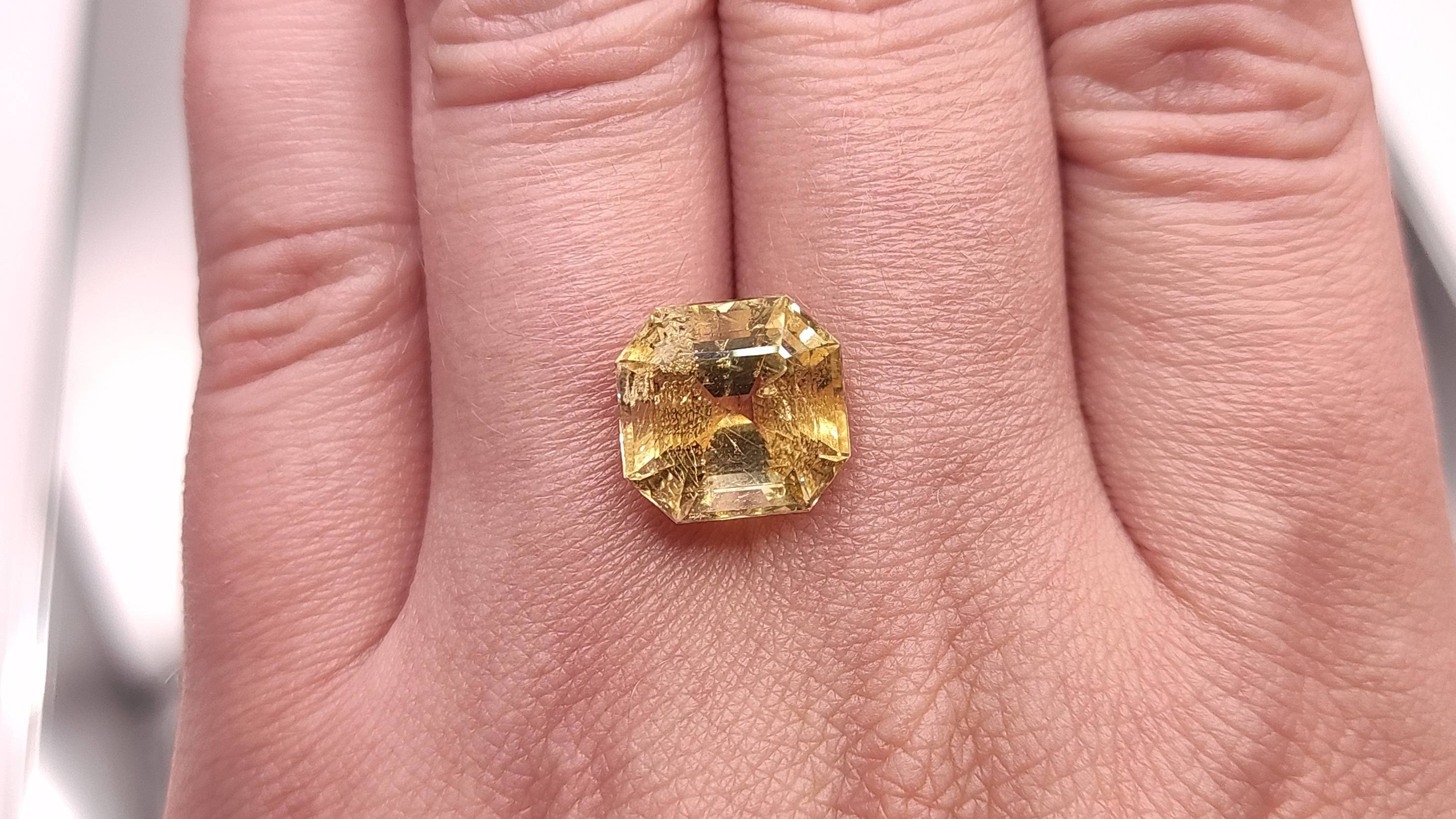 Гелиодор октагон, 7,86 ct. Место добычи камня - Замбия. Природный камень, облагораживание - облучение. Чистота: VS2(GIA)Г2 (Xtl). Размеры: 11.95 x 11.51 x 8.81 мм. №1419