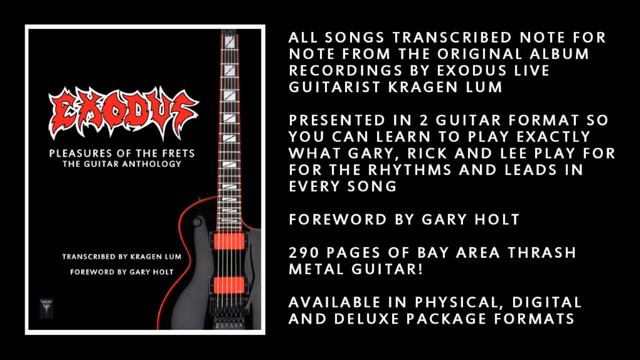 AVAILABLE NOW! at shop.sublevelrecords.com Pleasures Of The Frets: The Guitar Anthology The first official Exodus guitar book! 12 songs including: - A Lesson In Violence - The Ballad Of Leonard And Charles - Blacklist - Blood In Blood Out - Bonded By Blood - Children Of A Worthless God - Fabulous Disaster - Pleasures of the Flesh - Scar Spangled Banner - Strike Of The Beast - The Toxic Waltz - War Is My Shepherd All songs transcribed note for note from the original album recordings by Exodus live guitarist Kragen Lum Presented in 2 guitar format so you can learn to play exactly what Gary, Rick and Lee play for the rhythms and leads in every song Foreword by Gary Holt 290 pages of Bay Area Thrash Metal guitar! Available in physical, digital and deluxe package formats Deluxe package includes exclusive t-shirt and guitar pick set! FEEL THE POWER OF YOUR UNHOLY SHRED! PRE-ORDER NOW: shop.sublevelrecords.com
