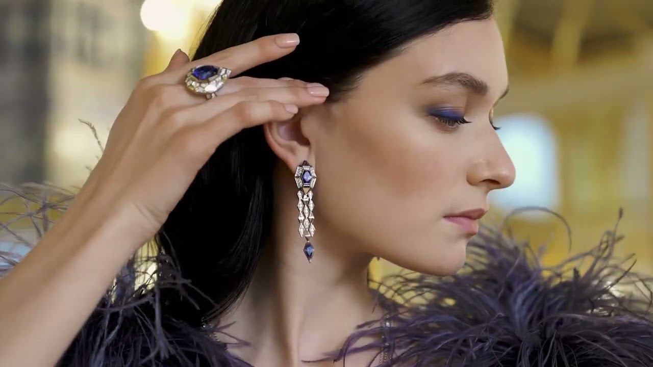 Роскошный сет «Вечерний Сингапур» соединил восхитительные танзаниты, футуристичный дизайн и запатентованный механизм, регулирующий угол поворота серьги. Танзанит 15,7 ct насыщенного синего цвета — доминанта «Сингапура». Футуристический дизайн кольца отражает уникальную динамику азиатского мегаполиса, сверкающего миллиардами огней. Поддерживают образ удлиненные серьги с танзанитами и бриллиантами. Пронзительное сияние танзанитов, футуристичный дизайн и эффектные трансформации — серьги заслужено получили главную премию в номинации «Лучшее украшение сезона» международного конкурса ювелирных и часовых брендов на выставке JUNWEX-2021. The luxurious "Evening Singapore" set combines delightful tanzanites, futuristic design, and a patented mechanism that adjusts the angle of the earrings. 15.7 ct tanzanite in deep blue colour is the centerpiece of "Singapore." The futuristic design of the ring reflects the unique dynamism of the Asian metropolis, ablaze with billions of lights. The extended tanzanite and diamond earrings complete the look. The piercing glow of tanzanites, futuristic design, and spectacular transformations; the earrings deservedly won the main award in the category "Best Jewellery of the Season" of the International Competition of Jewellery and Watch Brands at JUNWEX-2021.