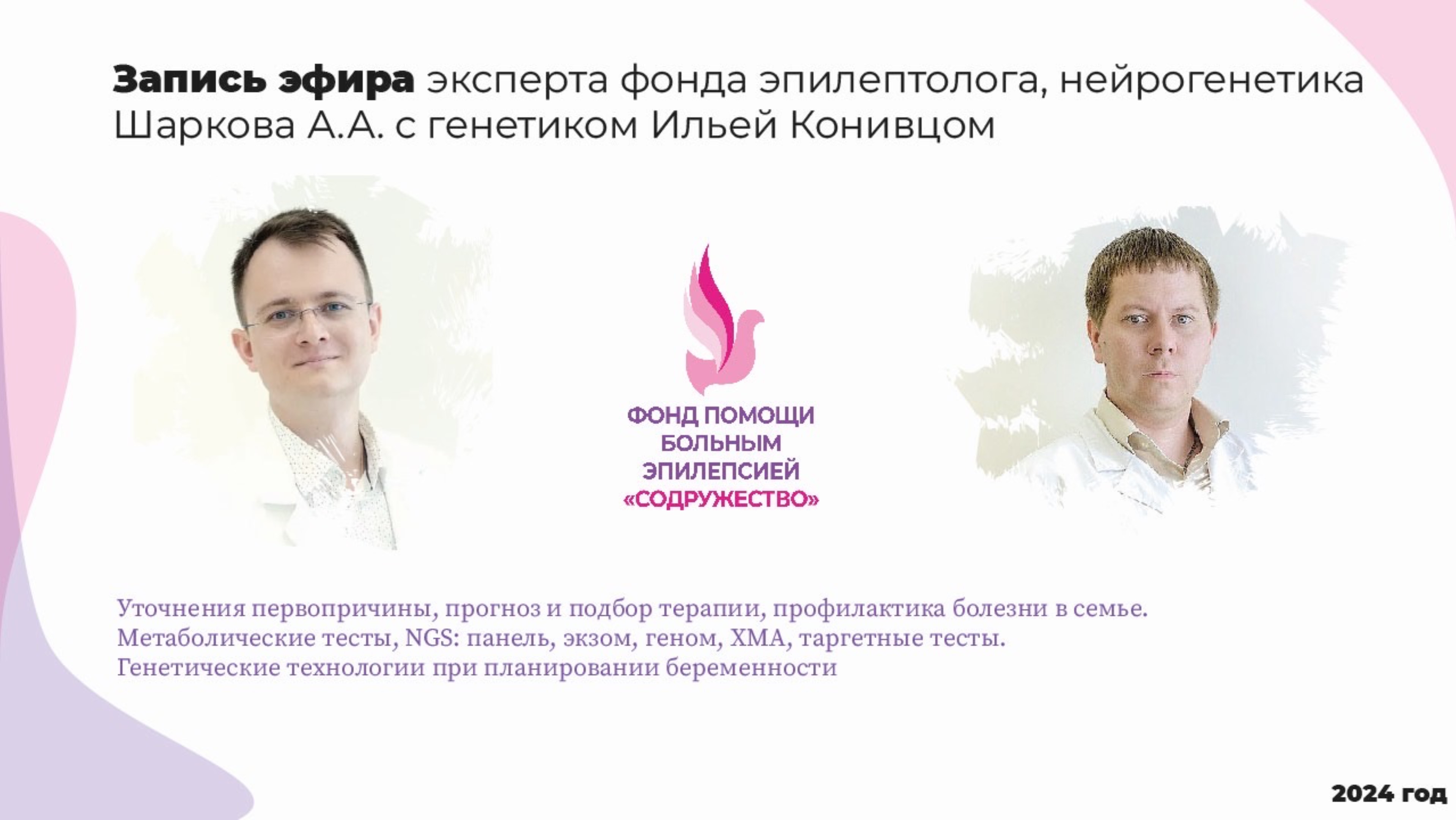 #кЭфир ная неделя #генетика #эпилепсия #генетик #Канивец #Шарков #фиолетовый день 1. Кому: эпилепсии с неизвестной этиологией, с прогрессирующим течением, фармакорезистентностью, определенными изменениями на ЭЭГ/МРТ, специфическим фенотипом (пороки развития, аномалии развития), нарушением нейроразвития, семейным анамнезом 2. Зачем: уточнения первопричины, прогноз и подбор терапии, профилактика болезни в семье. 3. Как: метаболические тесты (1 год жизни, кризовое течение), NGS: панель, экзом, геном (геном наиболее информативный анализ), ХМА, таргетные тесты. Какие существуют генетические технологии при планировании беременности (пренатальная/предимплантационная с ЭКО). Набор тестов, снижающих риски генетических болезней ребенка, для любой пары, планирующих беременность. https://genomed.ru/doctors/kanivecz-ilya-vyacheslavovich https://t.me/drSharkov https://eeglab.ru/