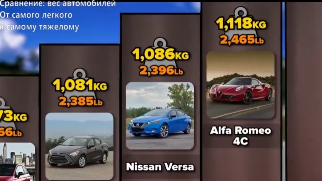 Сравнение веса автомобилей от лёгкого к тяжёлому.