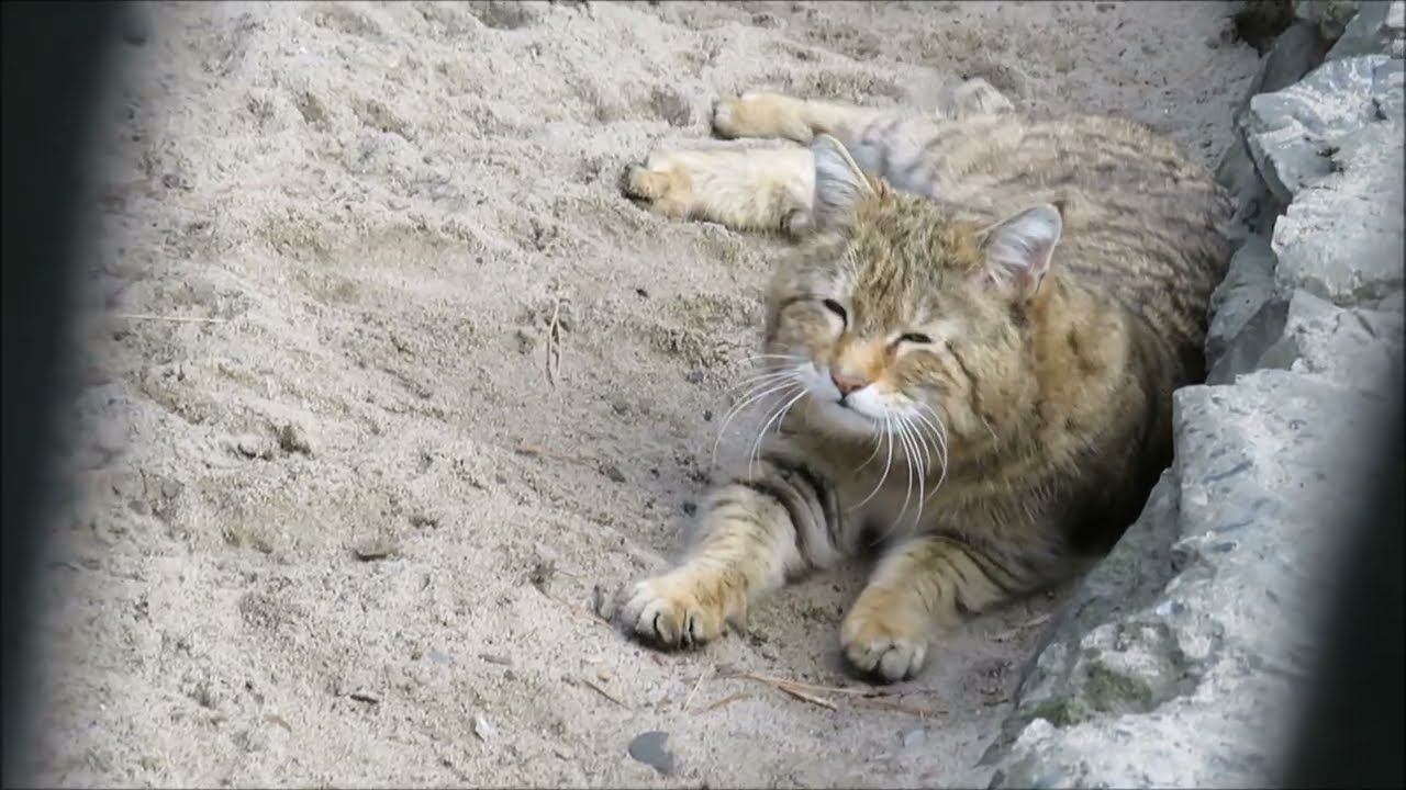 Европейский лесной кот отдыхает на песке 26.04.2023