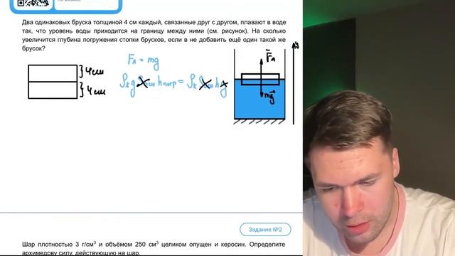 Два одинаковых бруска толщиной 4 см каждый, связанные друг с другом, плавают в воде - №22003