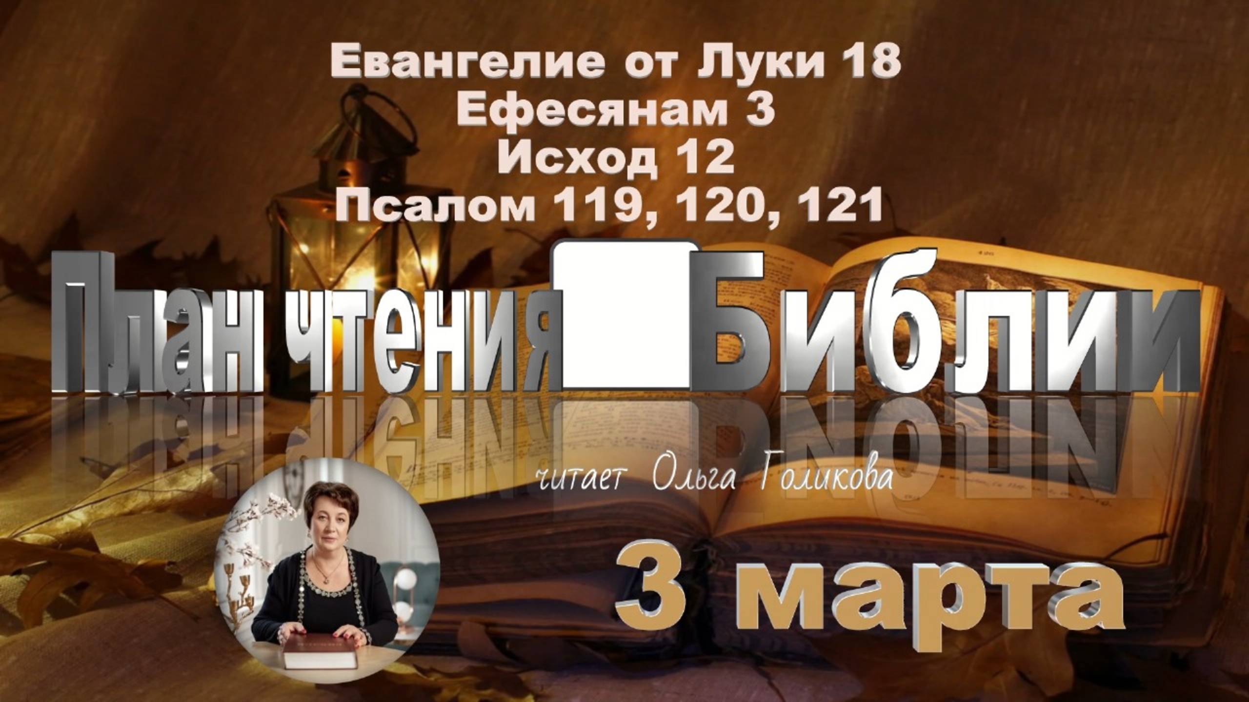 3 марта - Евангелие от Луки 18; Ефесянам 3; Исход 12; Псалом 119, 120, 121 0:00 – заставка 0:00:05 - Евангелие от Луки 18 0:05:03 - Ефесянам 3 0:07:45 - Исход 12 0:15:35 - Псалом 119, 120, 121 --------- Библия для вас на канале: Вечное Живое Слово https://www.youtube.com/channel/UCsZA-iW_g9Nzb3uGGWNUxjw --------------- Друзья, если вы получаете благословение от служения (ГОД) Голиковой Ольги Дмитриевны, то можете поддержать это служение и пожертвовать: 2200 1529 9510 8720 Альфа-Банк 2200 7006 2691 2744 Тинькофф Яндекс.Деньги: 4100 1227 2545 992 Расчетный счет в сбербанке: http://msh.spb.ru/pozhertvovaniya Сайт церкви: http://msh.spb.ru Наши контакты. Подписывайтесь - https://msh.spb.ru/social МЕСТНАЯ РЕЛИГИОЗНАЯ ОРГАНИЗАЦИЯ ХРИСТИАН ВЕРЫ ЕВАНГЕЛЬСКОЙ "МИССИЯ "СВЕТ ХРИСТА" Свидетельство о государственной регистрации религиозной организации № 288-Р от 10.05.2000