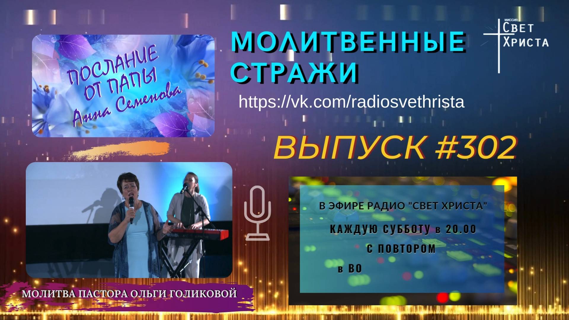 Молитвенные стражи. Выпуск 302. Радио "Свет Христа" 0:00 – заставка 0:00:27 – послание от Папы принимает и читает Анна Семенова 0:03:03 – молитва с группой прославления 0:40:09 - пропитка ------------ Друзья, если вы получаете благословение от служения (ГОД) Голиковой Ольги Дмитриевны, то можете поддержать это служение и пожертвовать: НОВЫЕ РЕКВИЗИТЫ!!! 2200 1529 9510 8720 Альфа-Банк 2200 7006 2691 2744 Тинькофф - без комиссии перевод через СБП (система быстрых платежей), Яндекс.Деньги: 4100 1227 2545 992 Расчетный счет в сбербанке: http://msh.spb.ru/pozhertvovaniya Сайт церкви: http://msh.spb.ru Наши контакты. Подписывайтесь - https://msh.spb.ru/social МЕСТНАЯ РЕЛИГИОЗНАЯ ОРГАНИЗАЦИЯ ХРИСТИАН ВЕРЫ ЕВАНГЕЛЬСКОЙ "МИССИЯ "СВЕТ ХРИСТА" Свидетельство о государственной регистрации религиозной организации № 288-Р от 10.05.2000