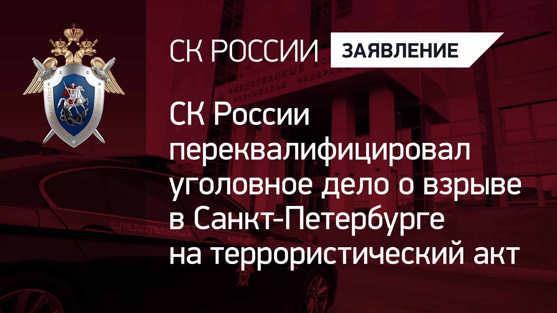 СК России переквалифицировал уголовное дело о взрыве в Санкт-Петербурге на террористический акт