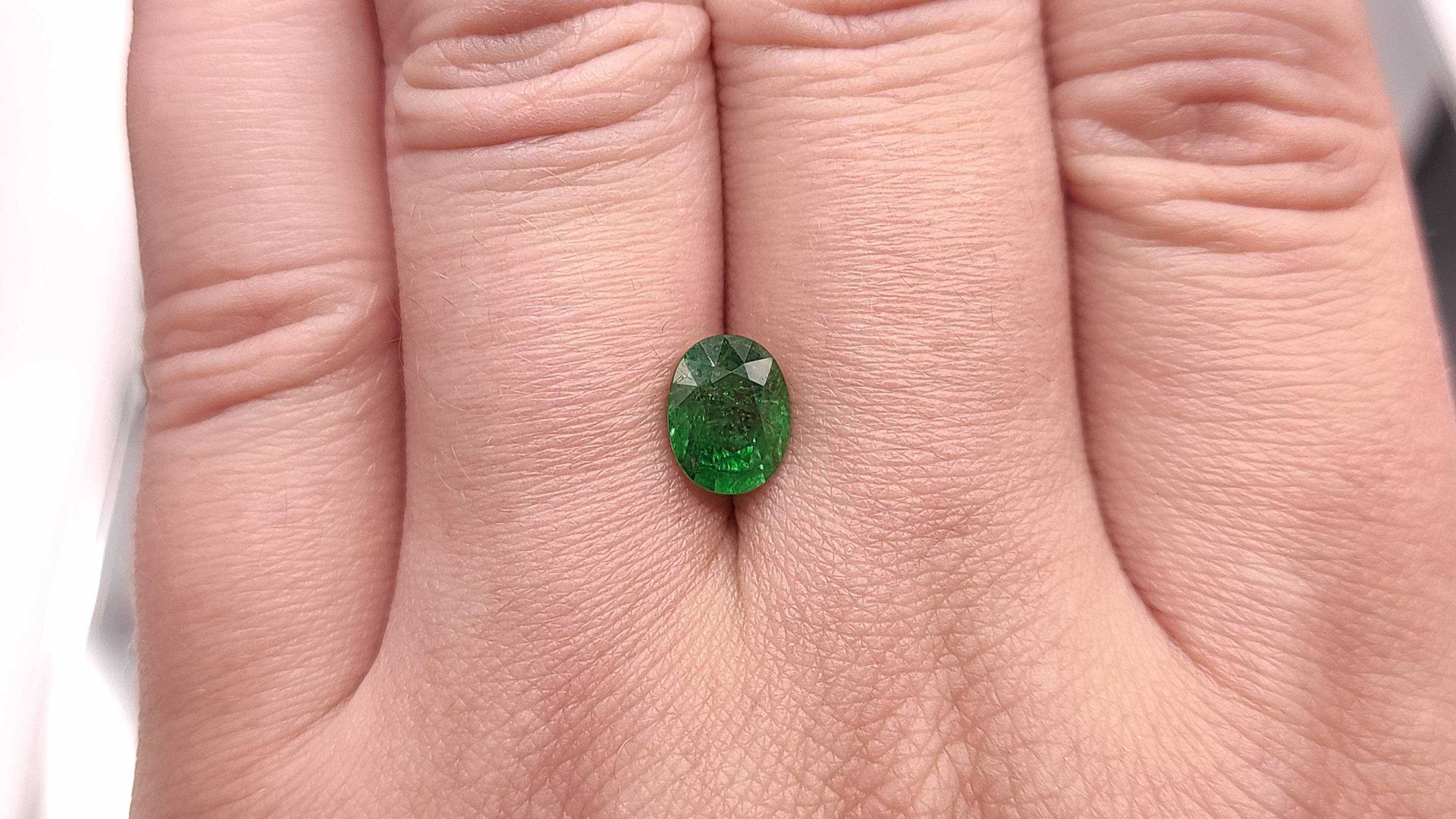 Гранат Цаворит овал 1.92 ct. Место добычи камня - Танзания. 100% природный камень, без облагораживания. Чистота: I1(GIA):Г3 (Xtl; Ftr), смещённый шип. Размер: 8,51 х 6,61 х 4,40 мм. №1428