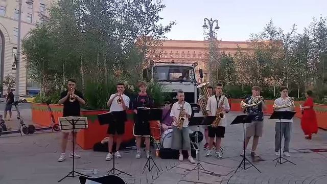 Вот так необычно и здорово звучит хит военного времени Синий платочек в исполнение духового оркестра юнных музыканов на Лубянской площади в Москве.