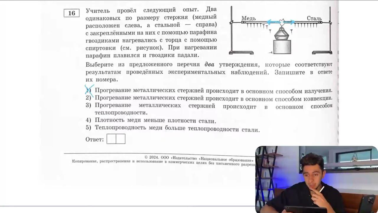 Учитель провёл следующий опыт. Два одинаковых по размеру стержня (медный расположен слева - №27917