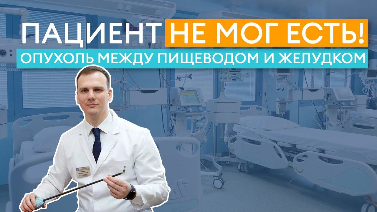 У пациента перестала проходить пища во время еды, при обследовании выявили опухоль, которая располагалась на границе между пищеводом и желудком и перекрывала просвет пищевода и желудка, препятствуя прохождению пищи. Пациент обратился в клинику без диагноза, биопсию из опухоли не брали. Первым этапом, пока ожидали биопсию, чтобы понять строение опухоли, пациенту поставили стент (саморасправляющуюся трубку) в зону опухолевого сужения, больной начал питаться через рот. Когда получили данные о клеточном строении опухоли, приняли решение о хирургическом лечении. Удалили часть пищевода и желудка. Из оставшейся части желудка выкроили узкую трубку и пришили ее к пищеводу в груди. Этап операции в грудной полости выполнили малоинвазивно – через проколы, без разреза груди. ---------------------------------------------- Сергей Осминин доцент кафедры факультетской хирургии №1 Сеченовского Университета, хирург-онколог, кандидат медицинских наук +7 495 7222 085 www.пищевод-желудок.рф