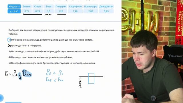 Ученик помещал цилиндр объёмом V 10 см^3, не удерживая его, в различные жидкости - №22012