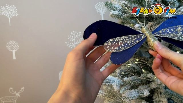332458 Украшение елочное Мотылек винтажное велюровое с блестящими элементами синее 12см