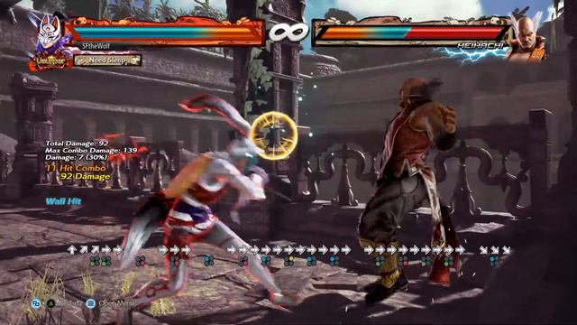 the game says 156 but that's because turning on training mode's counter hits results in the guaranteed ff2 being erroneously granted counter hit damage, an extra 2 points in this context this is nearly match viable. the first wall splat sequence is precise to a matter of inches. in a real game I'd recommend floor breaking with df3+4 for consistency. you can also floor break with SET uf4 if you somehow didn't end up next to the wall but this will put you farther from the corner post break. you'd think this would make an extra hit into splat into rage drive easier, but it usually results in the opponent twisted strangely which will cause the rage drive to fail, so I recommend rage driving immediately after the break if you broke with SET uf4. it'll still get you the post drive wall splat