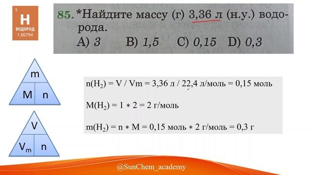 Найдите массу (г) 3,36 л (н.у.) водорода.
