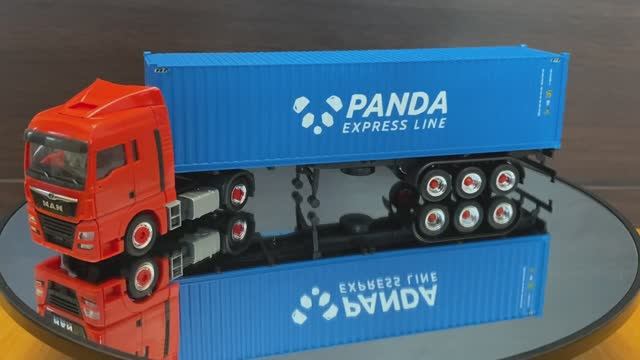 Модель двухосного (4х2) грузового автомобиля - седельного тягача MAN TGX XXL с полуприцепом-контейнеровозом и 40-футовым контейнером Panda Express Line (Россия) в масштабе 1:87. Тягач с полуприцепом производства компании Herpa, контейнер - студии SalivanGreen. Надписи изготовлены методом фотополимерной печати. Контейнер снимается и устанавливается на полуприцеп, надежно фиксируется. Диски тягача и прицепа заменены на хромированные.