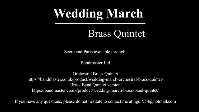 Wedding March by Felix Mendelssohn Arranged for Brass Quintet by Nigel Simmons Hepplewhite Music © Copyright 2021 Bandmaster Ltd All Rights Reserved. International Copyright Secured. Score and Parts available through Bandmaster Ltd Orchestral Brass Quintet version https://bandmaster.co.uk/product/wedding-march-orchestral-brass-quintet/ Brass Band Quintet version https://bandmaster.co.uk/product/wedding-march-brass-band-quintet/ If you have any questions, please do not hesitate to contact me at ngs1954@hotmail.com