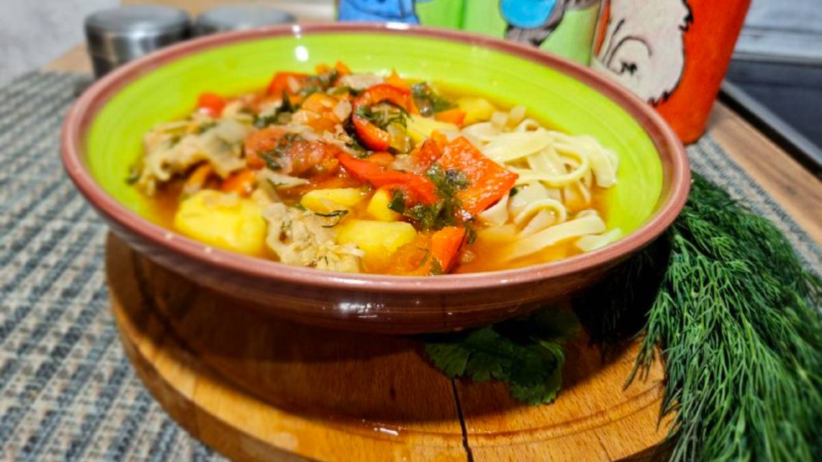 Готовим на 3 порции. Калорийность порции 344 ккал 🍽️ Состав: 🍗Филе бедра курицы - 300 гр. 🍜Лапша домашняя или для лагмана – 90 гр. 🍅Помидоры - 2 шт. 🥔Картофель – 2 шт. 🥕Морковь – 1 шт. 🧅Лук – 1 шт. 🫑Перец болгарский – 1 шт. 🥄Масло растительное – 1 ч.л. 🥫Томатная паста – 1 ст.л. 🧄Чеснок- 3-5 зубчиков 🥬Ассорти свежей зелени 🧂Соль, перец, лавровый лист, кориандр по вкусу 🍽️ Приготовление: ⠀ Нарежьте лук, перец, картофель и морковь. Курицу порежьте на средние куски. ⠀ Помидоры опустите в кипяток примерно на 1 минуту. После ополосните холодной водой и очистите от кожицы. Нарежьте кубиками. ⠀ Смажьте сковороду маслом и обжарьте лук до золотого цвета. Выложите курицу и подрумяньте кусочки со всех сторон. Добавьте картофель и обжаривайте 3 минуты. Потом выложите в сковороду перец и морковь, готовьте 5-7 минут. Добавьте помидоры, обжаривайте 2 минуты, пока не пустят сок. ⠀ Переложите в кастрюлю, добавьте томатную пасту, чеснок, часть зелени и разбавьте кипятком по вашему вкусу. Посолите, поперчите, возьмите лавровый лист и специи по вашему вкусу. Тушите на небольшом огне под крышкой примерно 10 минут. ⠀ Лапшу отварите отдельно. Выложите в глубокую тарелку сначала лапшу, потом влейте суп и посыпьте свежей зеленью. 🎁 Получите свой подарок от Клуба снижения веса Lalavita: урок «Метод 5-ти шагов»! 📌Мы покажем вам эффективный путь к уменьшению веса всего за пять простых шагов, без изнурительных диет, физических упражнений и чувства голода. 📌 Позвольте себе разнообразие вкусных блюд и с радостью носите одежду, которая раньше была вам не по размеру. Получите 🎁 https://lalavita.site/2/?utm_source=rutube_grupa&utm_medium=vezde
