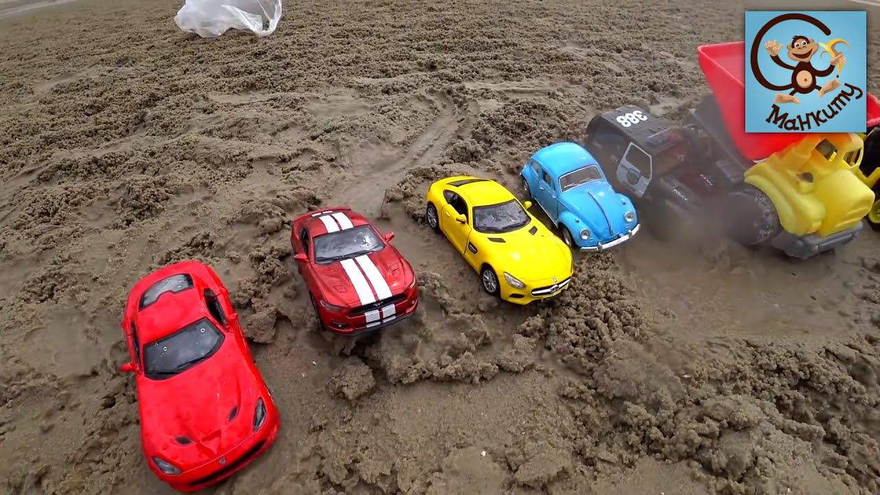 Машинки игрушки - Самосвал, автобус, снег и песок. Манкиту