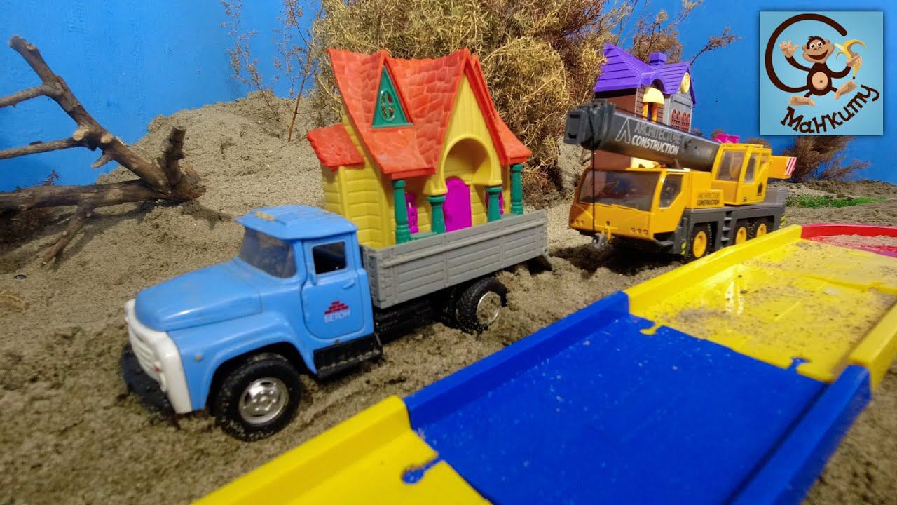 Машинки Игрушки - Экскаватор, Самосвал и Автокран строят горку. Манкиту