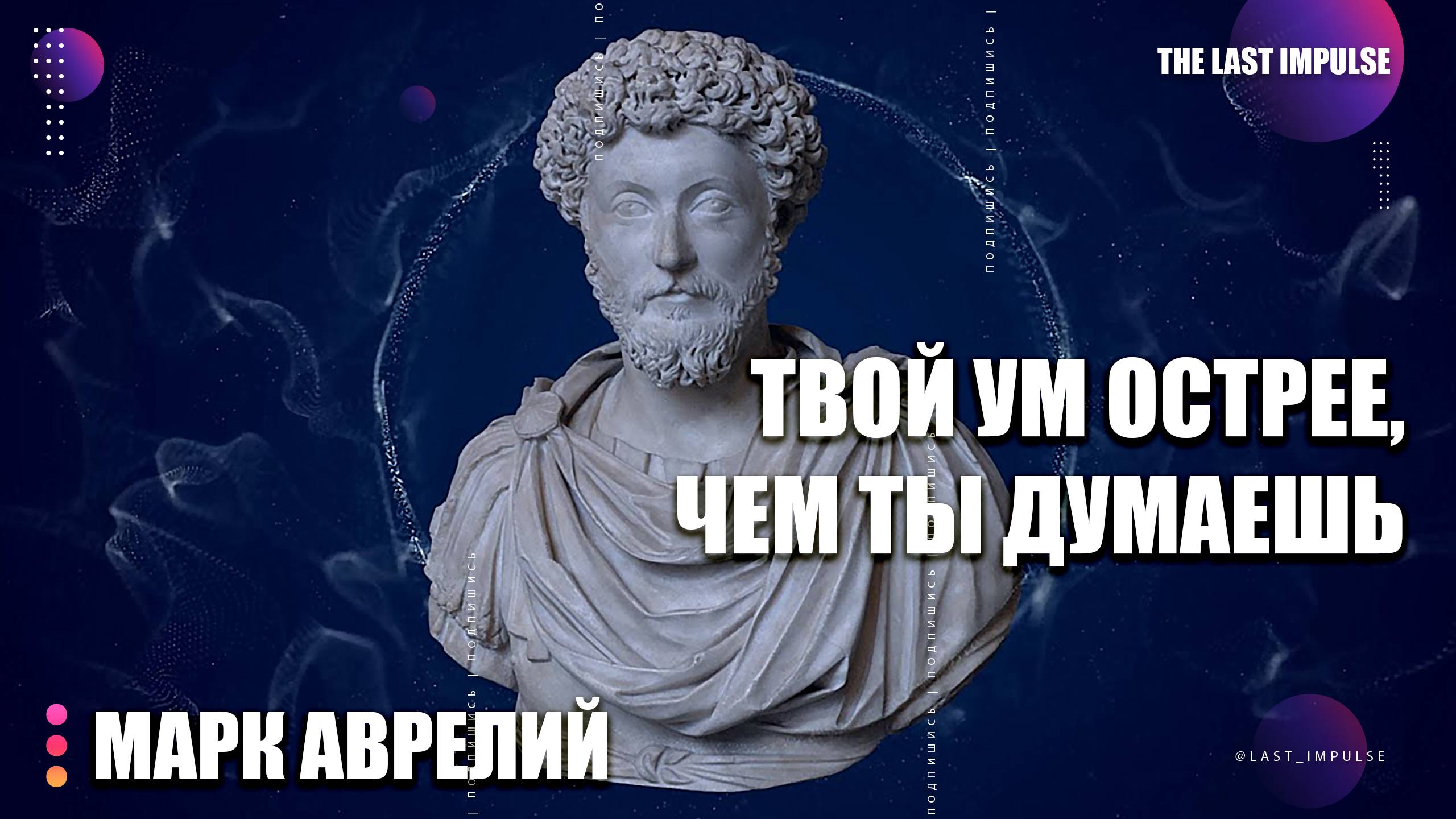 🧠 «Ваши мысли — алмазы. Пора их огранть!» Марк Аврелий, император-стоик, управлял империей через хаос, потому что знал: ясность мышления — оружие сильнее меча. Подписывайтесь на нас: tg - https://t.me/last_impulse vk - https://vk.com/last_impulse rutube - https://rutube.ru/channel/28242584/ Яндекс.Дзен - https://dzen.ru/last_impulse