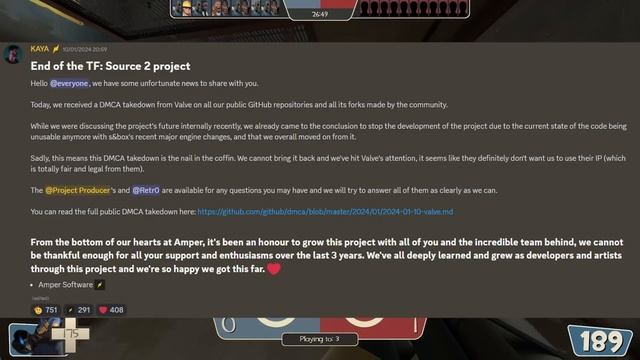 ▼▼▼▼▼ЧИТАЙ ИНФОРМАЦИЮ▼▼▼▼▼ https://quicksell.store - сайт для продажи и обмена вещей из Team Fortress 2! Сегодня мы разберем события, которые потрясли не только игроков Team Fortress 2, но и все игровое сообщество. А именно то, как Valve закрыли несколько фанатских проектов, заставив их авторов удалить все файлы, как игра вернулась в состояние 2007 года на несколько дней и как ожило движение #savetf2 Создатель Portal64: https://www.youtube.com/@james.lambert Петиция #savetf2: https://chng.it/6mSpxDkjd4 Сообщение от AmperSoftware: https://twitter.com/TeamFortressS2/status/1745157812563378649 Пост Гарри Ньюмена: https://twitter.com/garrynewman/status/1745317860363108527 Спасибо за просмотр!