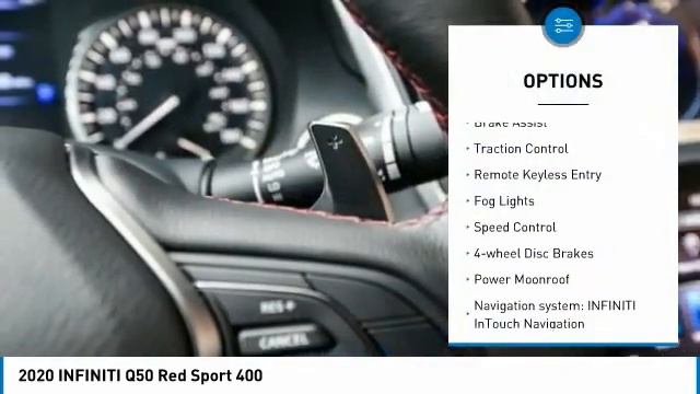 2020 INFINITI Q50 Red Sport 400 https://www.INFINITIhoffman.com/ For more information on this vehicle and our full inventory, call us at 224-653-2901 Zeigler INFINITI of Hoffman Estates 1075 W Golf Rd Hoffman Estates IL 60169 2020 Q50 INFINITI Red Sport 400 Graphite Shadow 16 Speakers, 4-Wheel Disc Brakes, ABS brakes, Anti-whiplash front head restraints, Apple CarPlay/Android Auto, Auto tilt-away steering wheel, Auto-dimming door mirrors, Auto-dimming Rear-View mirror, Automatic temperature control, Blind Spot Warning, Brake assist, Bumpers: body-color, Delay-off headlights, Dual front impact airbags, Dual front side impact airbags, Electronic Stability Control, Emergency communication system: INFINITI Connection, Front anti-roll bar, Front dual zone A/C, Fully automatic headlights, Garage door transmitter: HomeLink, Heated front seats, Heated Front Sport Seats, Heated steering wheel, Illuminated entry, Leather Shift Knob, Leather steering wheel, Low tire pressure warning, Memory seat, Navigation system: INFINITI InTouch Navigation, Occupant sensing airbag, Overhead airbag, Panic alarm, Passenger vanity mirror, Power moonroof, Quilted Semi-Aniline Leather Seating Surfaces, Radio data system, Radio: INFINITI InTouch w/Navigation, Rain sensing wipers, Rear anti-roll bar, Rear reading lights, Rear seat center armrest, Rear window defroster, Security system, Speed control, Speed-sensing steering, Speed-Sensitive Wipers, Split folding rear seat, Steering wheel memory, Steering wheel mounted audio controls, Telescoping steering wheel, Tilt steering wheel, Traction control, Trip computer, Turn signal indicator mirrors, Variably intermittent wipers, Wheels: 19 x 9 Aluminum-Alloy Sport.brbr19/26 City/Highway MPGbrOur Family, serving your Family the ultimate automotive experience. You can also reach INFINITI of Hoffman Estates any time by filling out our contact form or calling us. The entire staff at INFINITI of Hoffman Estates looks forward to serving you! Online price does not include sales tax, title, doc, or any installed hard adds or dealer accessories. Because of the high demand for used/new car inventory please call for availability. The vehicle may show on the website and not be in stock . 224-653-2901. The value of used vehicles varies with mileage, usage and condition. Book values should be considered estimates only.brINFINITI Certified Pre-Owned Details:brbr * 1-Year Prepaid Service Visit Included. 6 Year/75,000 Mile Warranty for Vehicles With Less Than 15,000 Miles at Time of Certification. 6 Year/Unlimited Mile Warranty for Vehicles with 15,001-60,000 Miles at Time of Certification. INFINITI ONLY Models Qualify.br * Limited Warranty: 72 Month/Unlimited Mile from original in-service datebr * Roadside Assistancebr * Transferable Warrantybr * Vehicle Historybr * 167 Point Inspectionbr * Warranty Deductible: $0