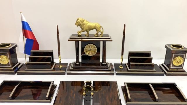 •Материал: обсидиан двух оттенков, кварцовый механизм, латунь. •Техника исполнения: камнерезные работы, нанесение нитрида титана с помощью УВН (установка вакуумного напыление). •Размеры: при плотной компоновке на столе 980*320*290мм. - Основание под часы 250*110*20мм-1шт. - Часы 220*80*270мм -1шт. - Карандашница 87*113*125мм-2шт. - Основание под карандашницу 112*112*20мм-2шт. - Основание под визитницу 245*110*20мм-2шт.. - Визитница 140*90*85мм-2шт. - Бумажница 250*120*30мм-2шт. - Календарница 255*200*30мм-1шт. - Ручки 10*10*195мм-2шт. •Упаковка: деревянный чемодан обтянутый кожзамом габариты 450*320*380мм. •Вес нетто: 15кг. •Вес брутто: 22,5кг.