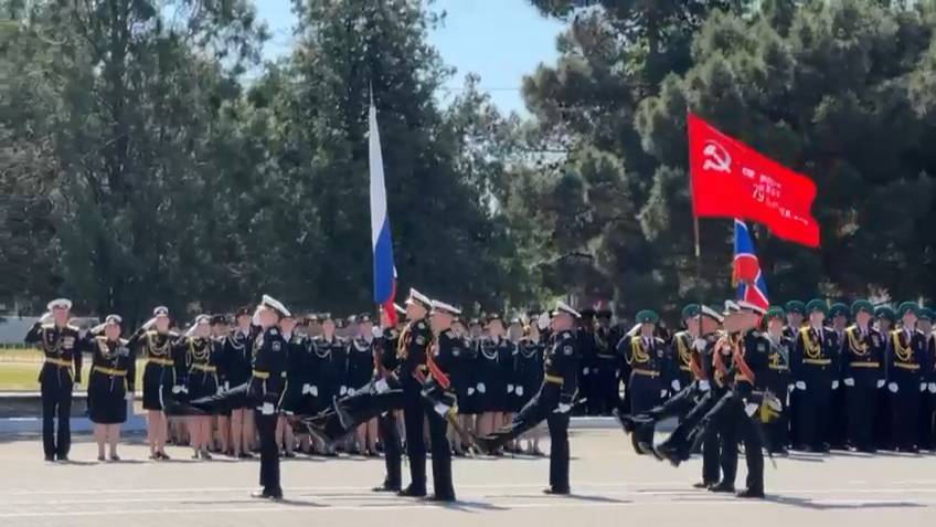 На площадь вносятся Государственный флаг Российской Федерации и Знамя Победы Впервые Знамя было пронесено на военном параде на Красной Площади 9 мая 1965 года по случаю 20-летия Победы.
