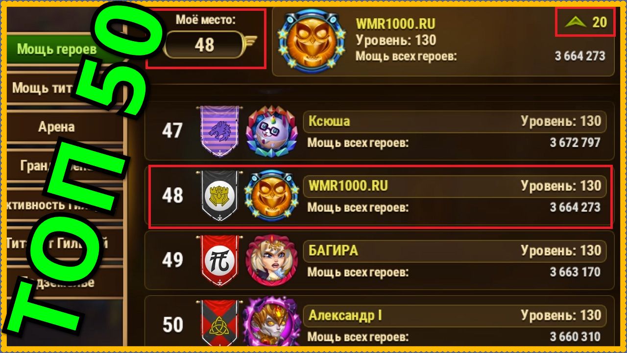 Хроники Хаоса выхожу в ТОП 50 в рейтинге мощи героев, повышаю уровень всем героям на 130