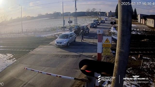 Польская автоледи застряла на железнодорожном переезде и не смогла съехать с пути самостоятельно. На помощь пришел мужчина на внедорожнике, который тросом вытолкал легковушку буквально из под носа поезда. Сопутствующий ущерб — два сбитых человека, включая виновницу, а также сломанный шлагбаум.