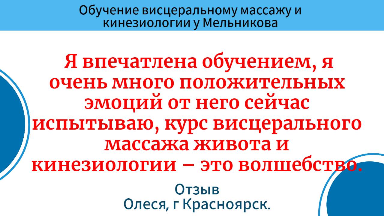 «Курс висцерального массажа живота и кинезиологии у Мельникова А.П. мне очень понравился. Я узнала много нового и интересного для себя в теме оздоровления, теперь точно знаю, что, владея навыками висцерального массажа и кинезиологии за 1-2 сеанса можно вылечить заболевания без таблеток, операций и химии. Я впечатлена обучением, я очень много положительных эмоций от него сейчас испытываю, курс висцерального массажа живота и кинезиологии – это волшебство. Я бы хотела, чтобы, как можно больше людей узнала про данную методику, особенно, медикам, массажистам, тренерам. Рекомендую обучение у Мельникова А.П. всем!» ✅ Подробнее про обучение кинезиологии и висцеральному массажу живота и бронь места на курсе https://ruszdrava.ru ✅ Связаться с менеджером и задать вопросы про обучение на курсах: +79222160707