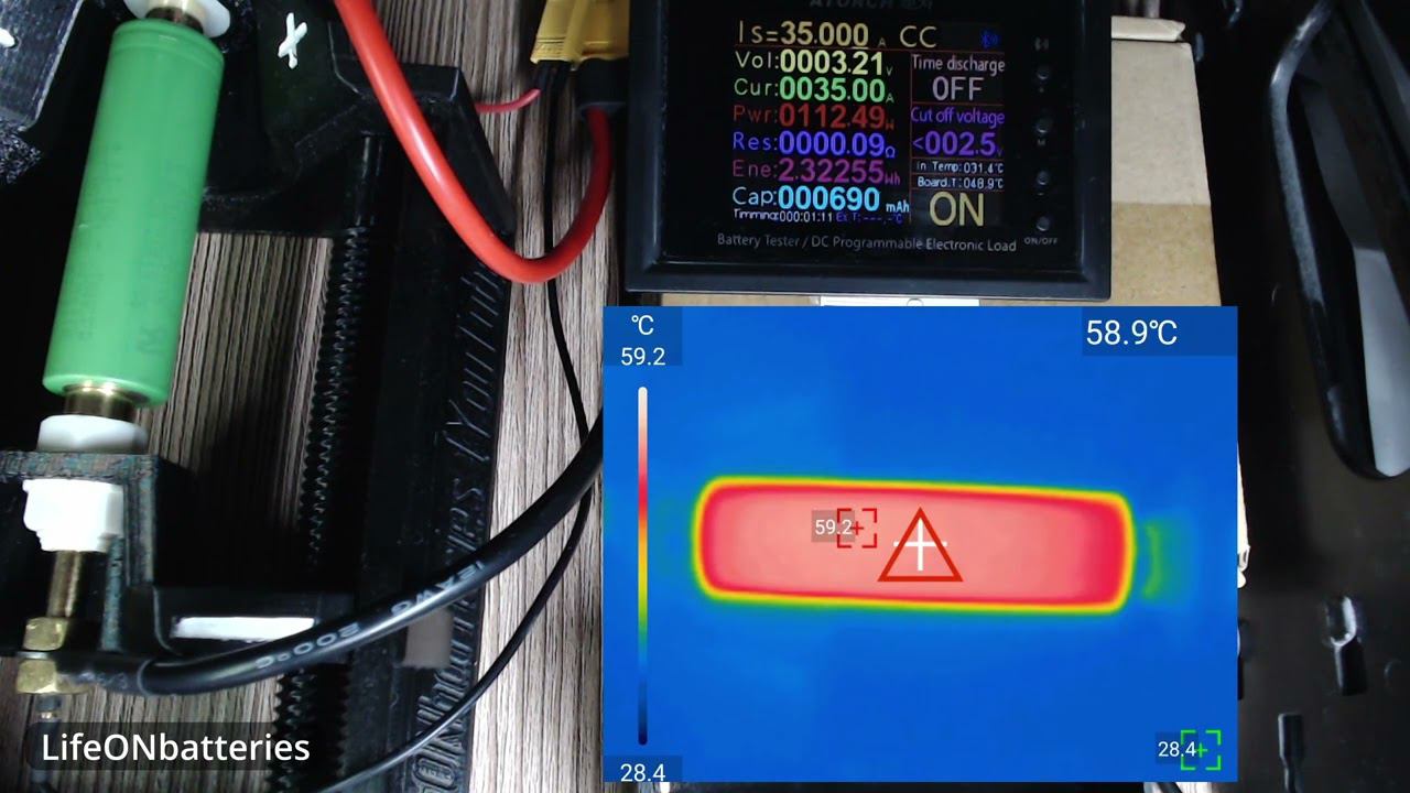 Murata VTC5A 35A discharge 75°C, разряд током 35А до 75°C 18650 vape test