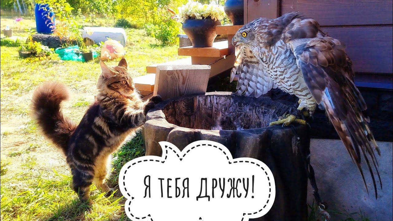 Кошка Морошка огребает от ястреба Клюквы. А, нет, не огребает
