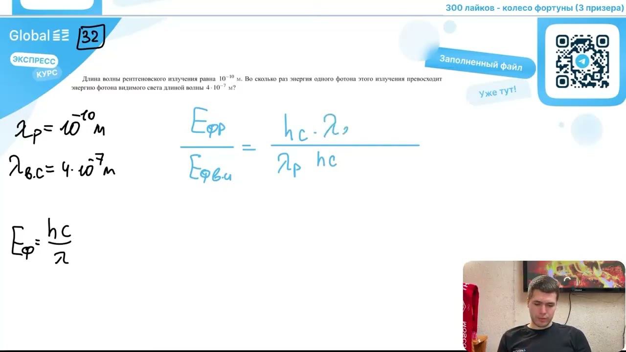 Длина волны рентгеновского излучения равна 10^-10 м. Во сколько раз энергия одного фотона - №27074