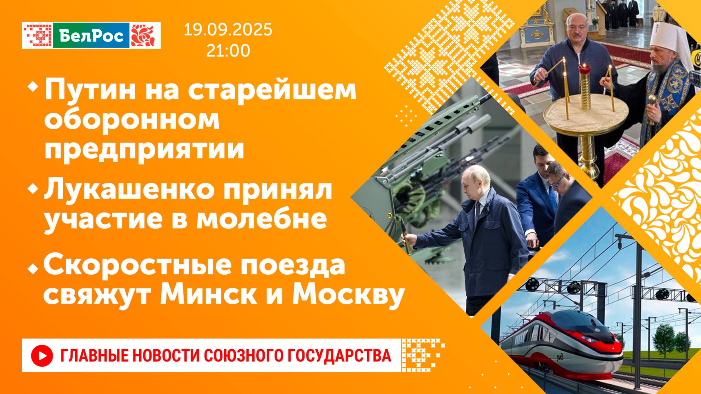 Закадровый текст озвучивает *ИИ Антон* Новости 19.09.2025 на 21:00 - Путин посетил выставку вооружений на старейшем оборонном предприятии - Лукашенко посетил Свято-Успенский мужской монастырь в Жировичах - Сергей Глазьев: между Москвой и Минском могут запустить скоростные поезда Смотрите главные новости Союзного государства на телеканале БелРос. Ссылки на наши соц. сети Сайт: http://belros.tv/ Telegram: https://t.me/belrostv Одноклассники: https://ok.ru/group/55657426976918 ВКонтакте: https://vk.com/belrostv TikTok: https://www.tiktok.com/@belros_tv?_t=... RuTube: https://rutube.ru/channel/23501830/ Яндекс. Дзен: https://zen.yandex.ru/belrostvv Наши подкасты на Яндекс. Музыке: https://music.yandex.ru/album/25615251 #главныеновости #новостисегодня #СоюзноеГосударство
