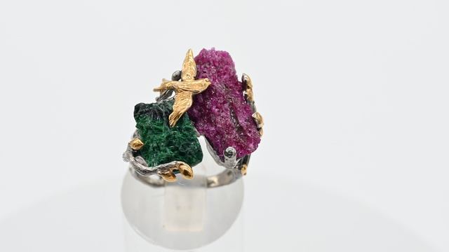 •Авторское украшение ручной работы. •Камни установлены в оправу из ювелирного сплава – нейзильбер с покрытием платино-рутения и позолотой. •Форма и рисунок камня никогда не повторяются, что делает данное изделие единственным в своем роде. •Вес 10,3 г •При заказе вы покупаете образец, который представлен на фото. •Размер камней: рубин 12*22мм, малахит 12*17мм. •Габарит кольца 27*24мм.